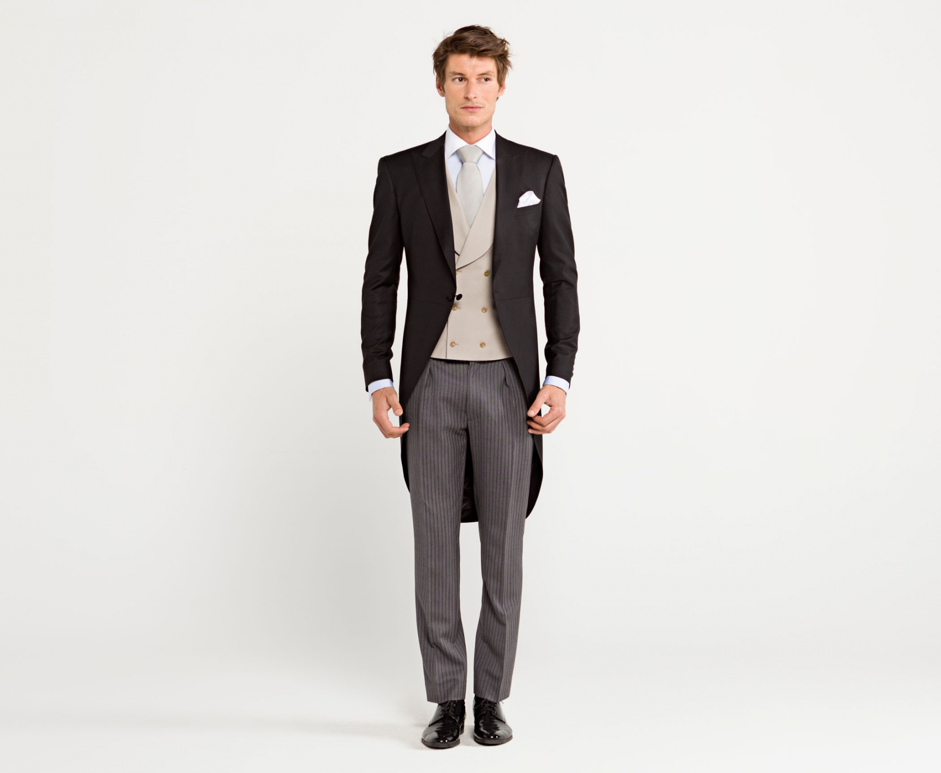 A distinguished ensemble perfect for weddings and formal day events. Includes a tailored black frock coat, grey-black pinstriped trousers, and a beige double-breasted waistcoat. Crafted in premium Super 120’s wool with luxurious cupro lining.